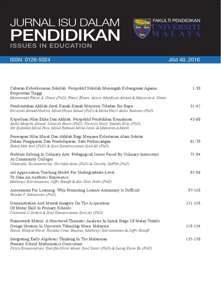 This Bilingual journal is published annually by the Faculty of Education, University of Malaya. It accepts articles related to the current issues in education. The journal publishes articles on a wide range of education-related topics which include reviews of issues in education, reports on research findings related to social problems and solutions as they related to education, as well as critical reflections on areas such as values and human-organizational interactions.